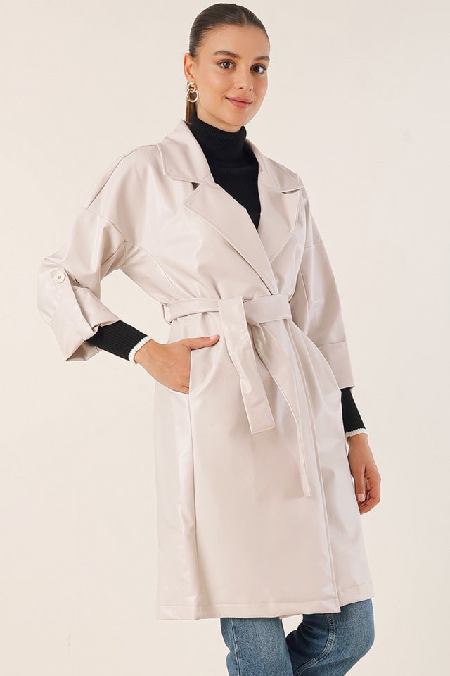 1034 Kuşaklı Suni Deri Trençkot - Ekru