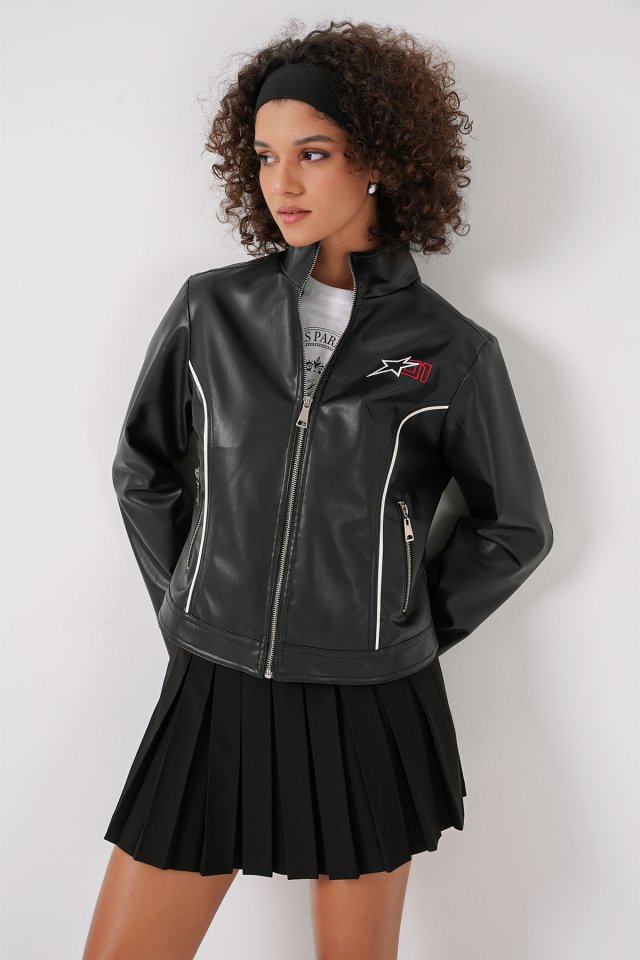 1041 Dik Yaka Suni Deri Ceket - Siyah