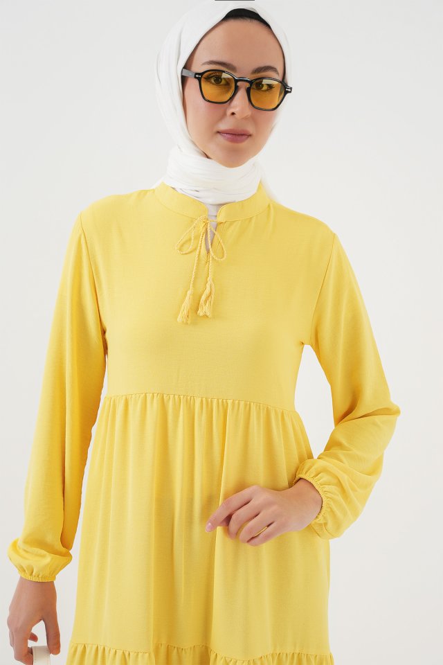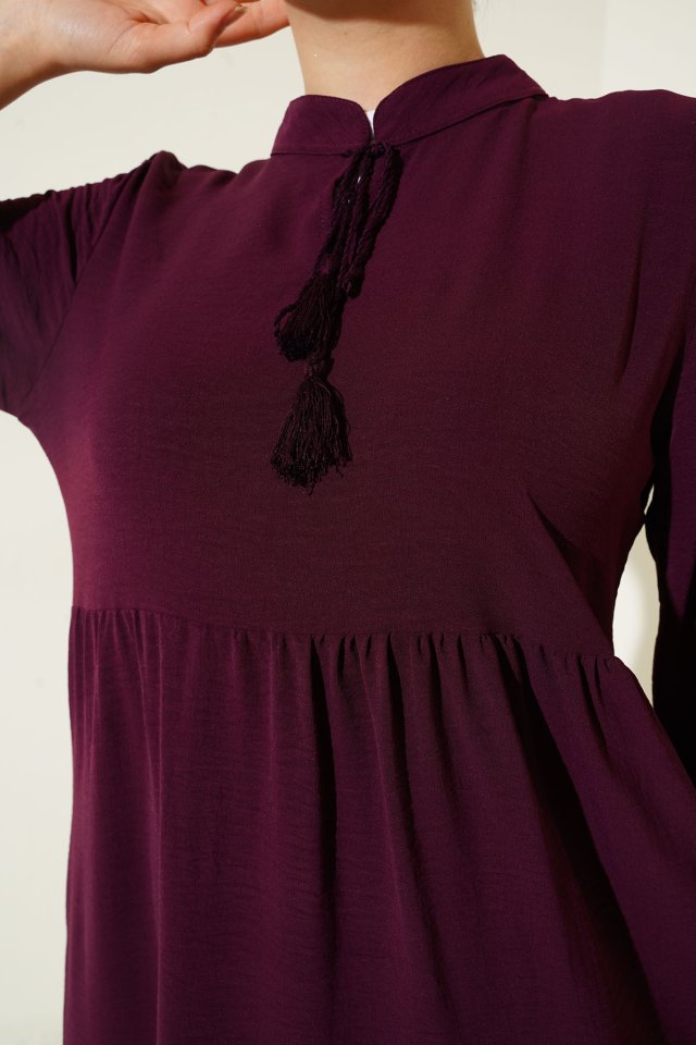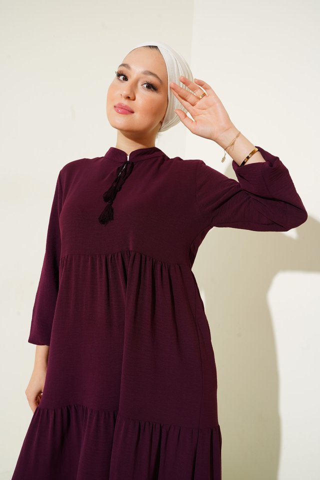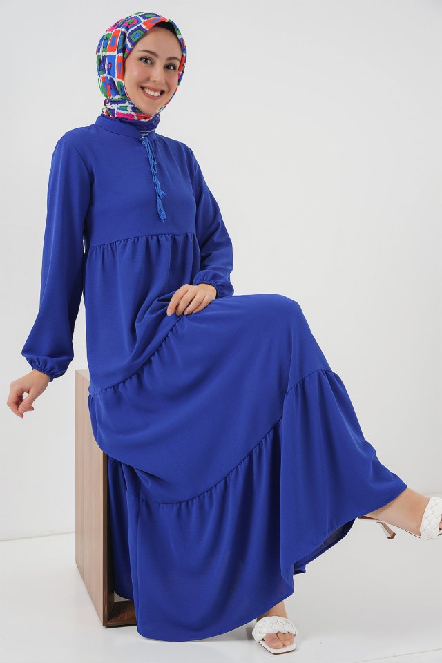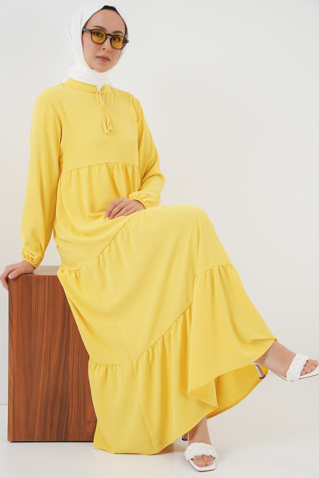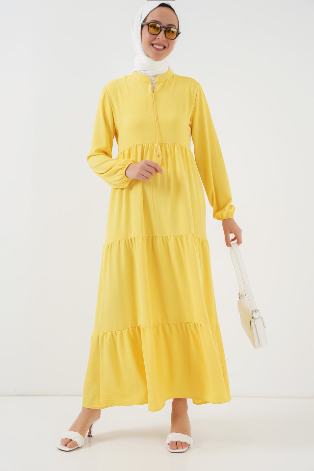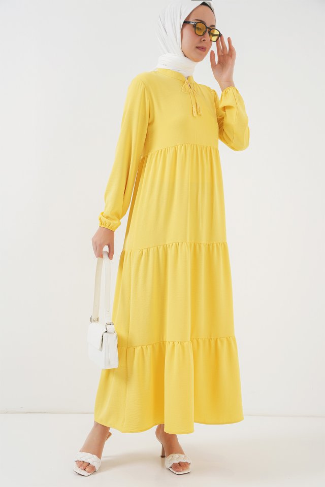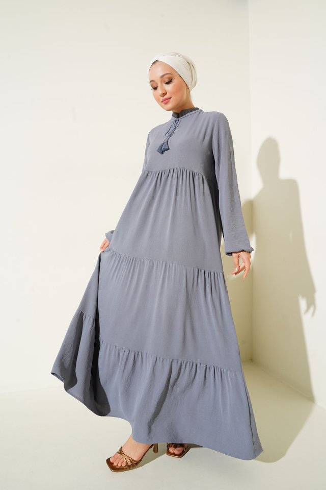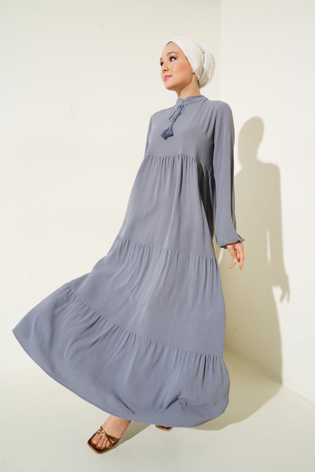1627 Yaka Bağcıklı Tesettür Elbise - Gri