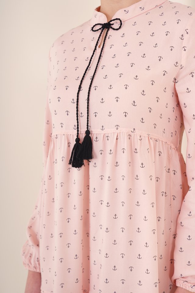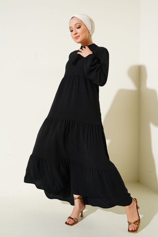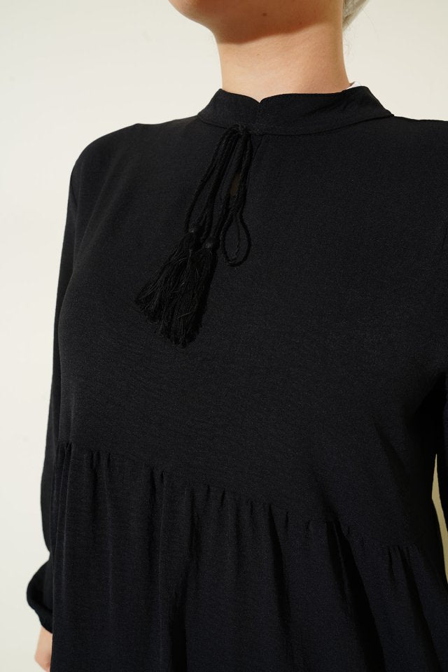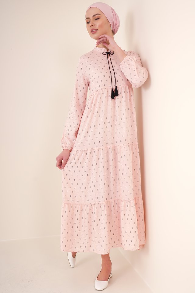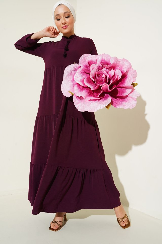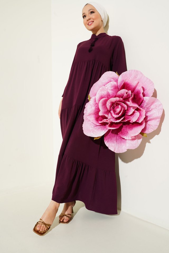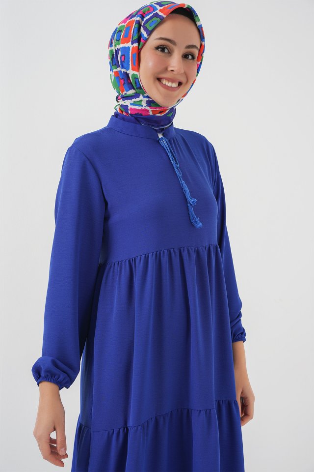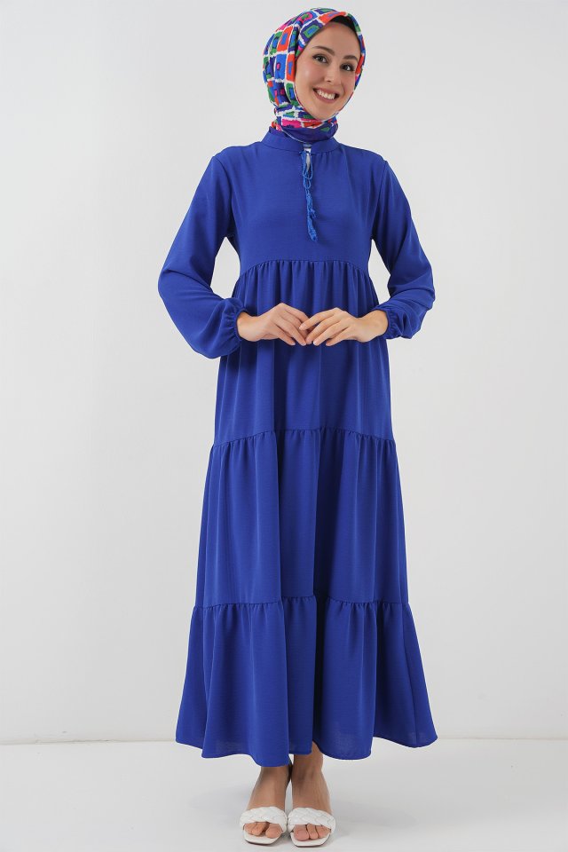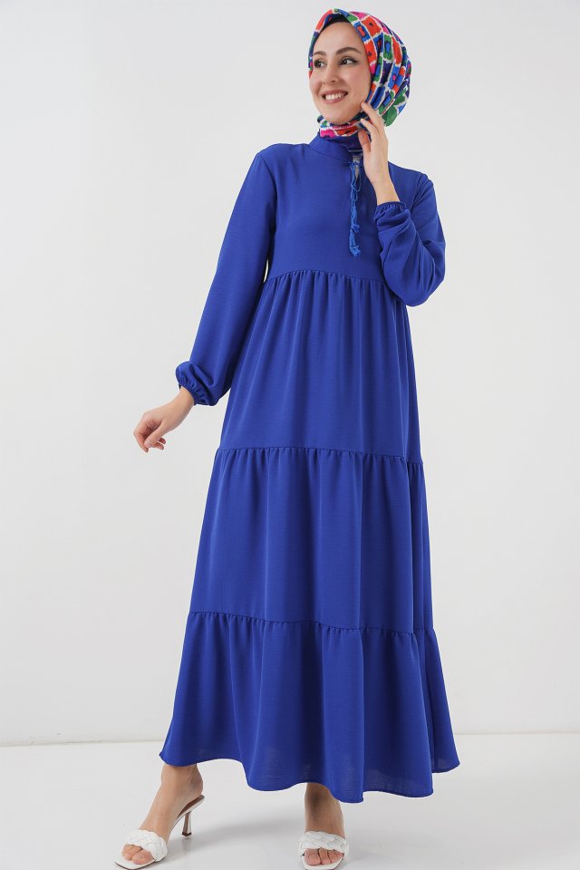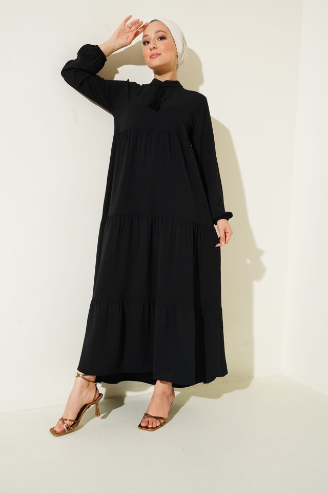 1627 Yaka Bağcıklı Tesettür Elbise - Gri