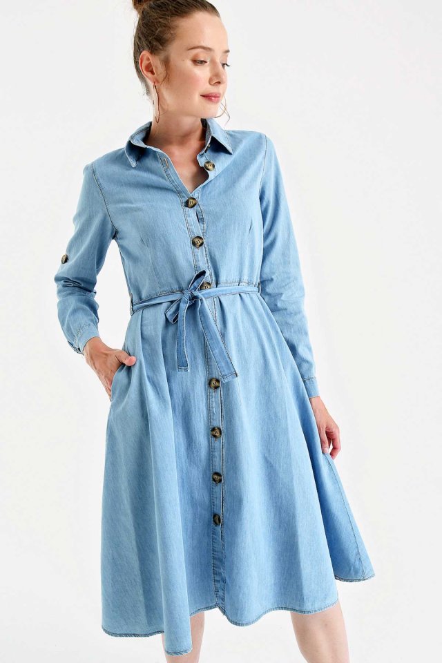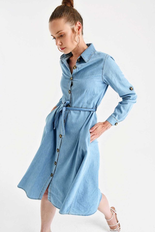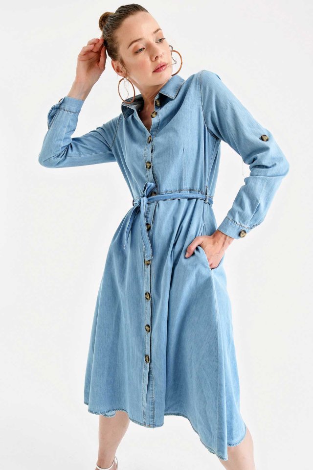 1924 KUŞAKLI KEMERLİ JEAN ELBİSE - Açık Mavi