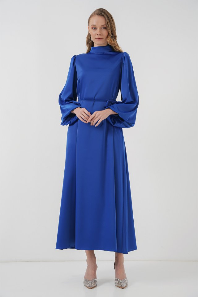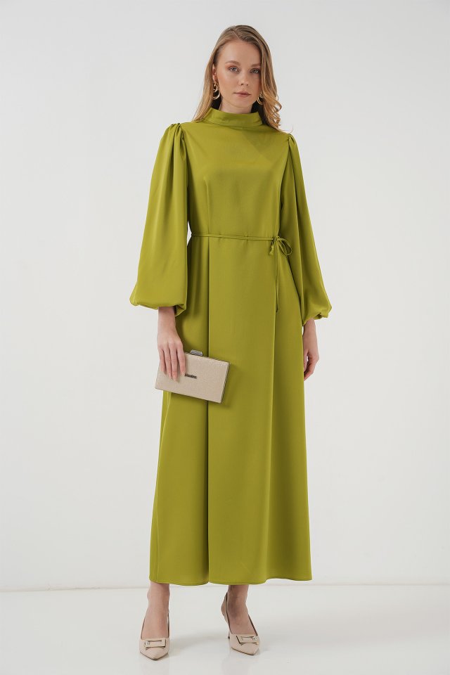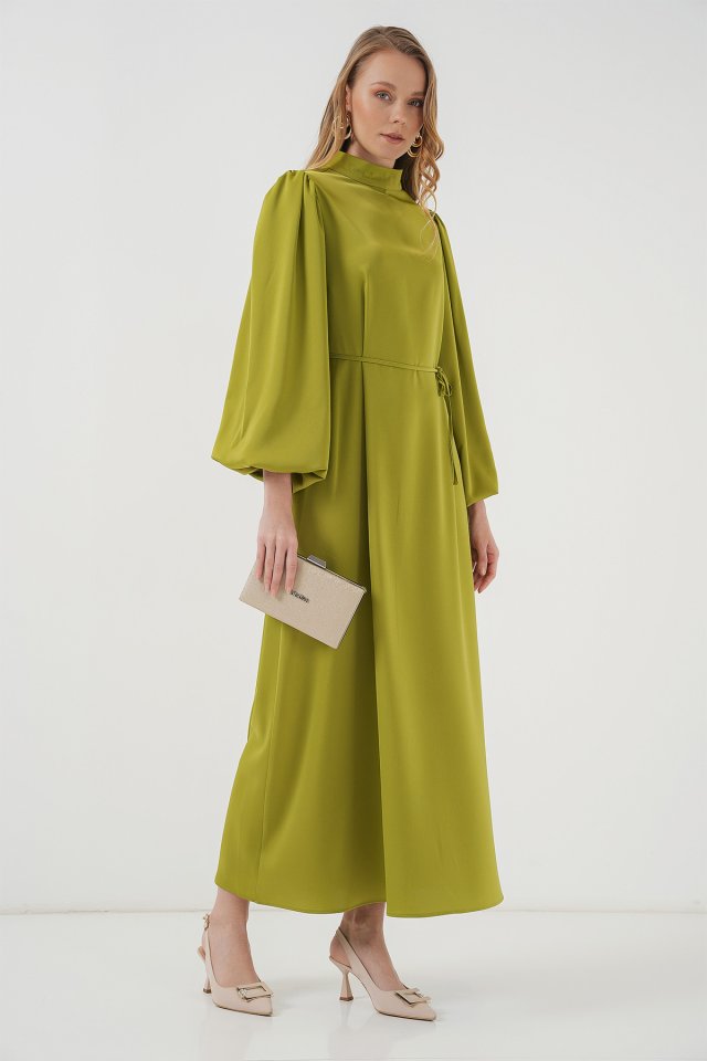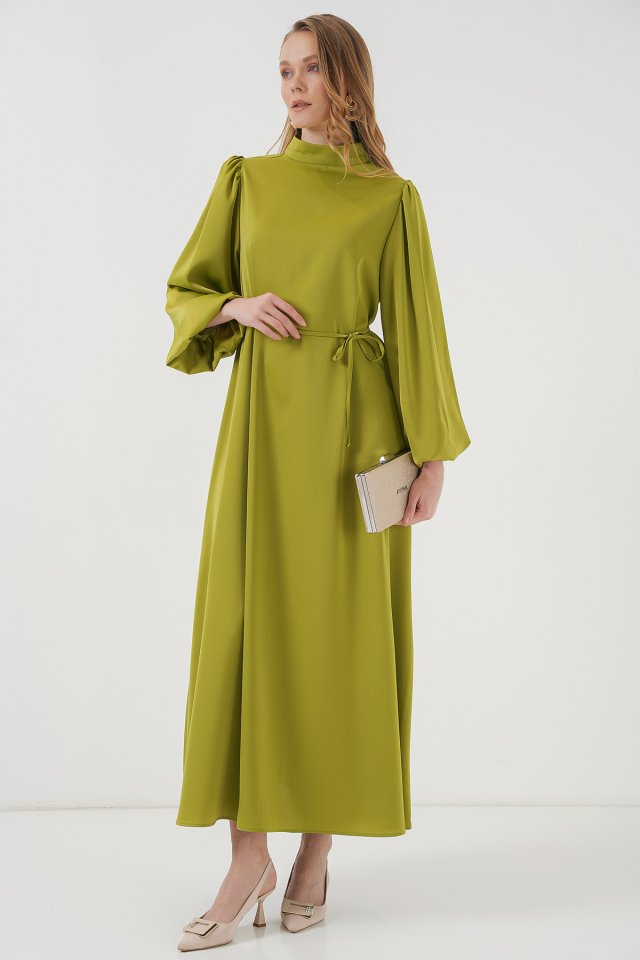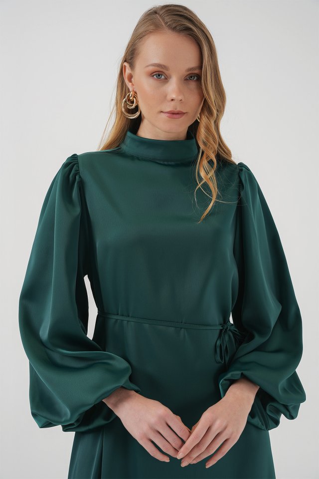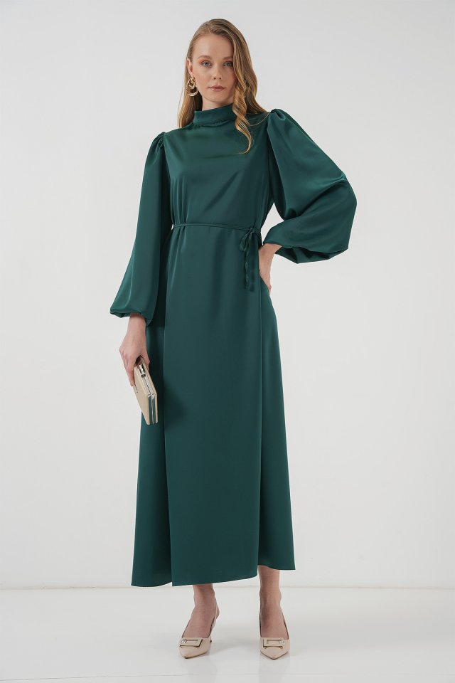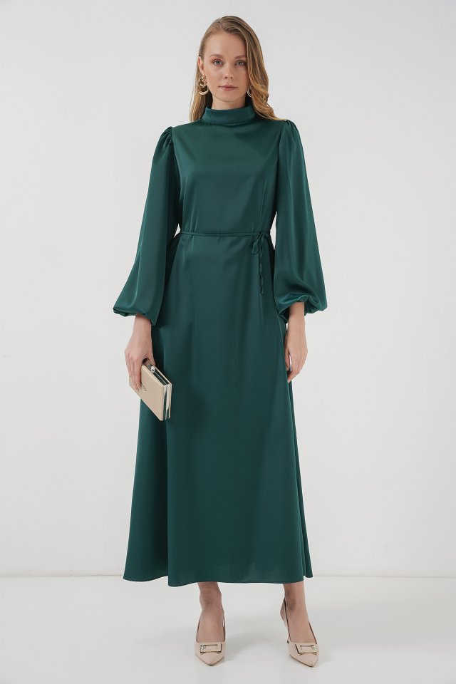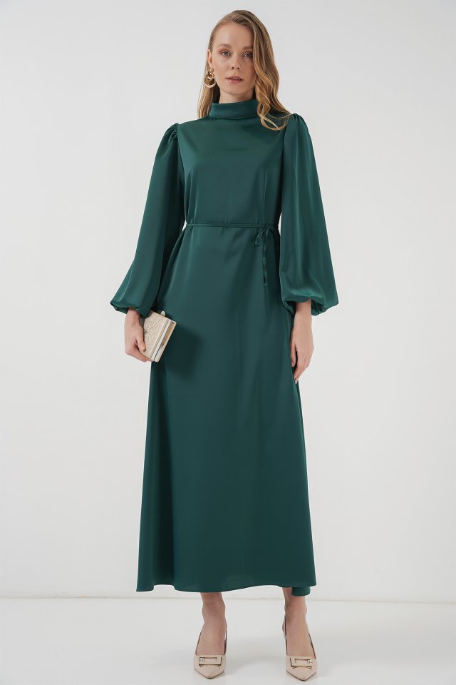 2510 Saten Tesettür Abiye Elbise - Zümrüt Yeşili