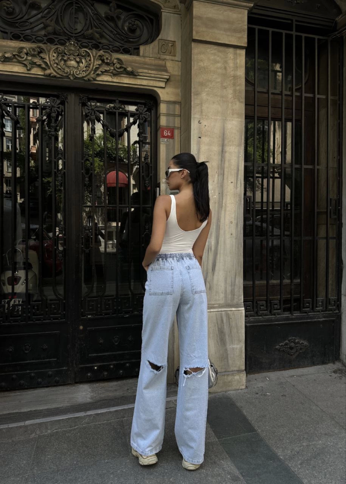 Arkadan Yırtmaçlı Jeans Kot Palazzo Pantolon - Mavi