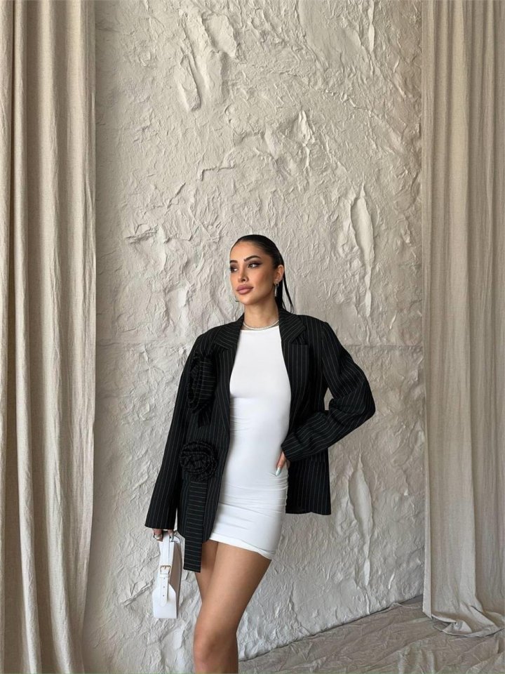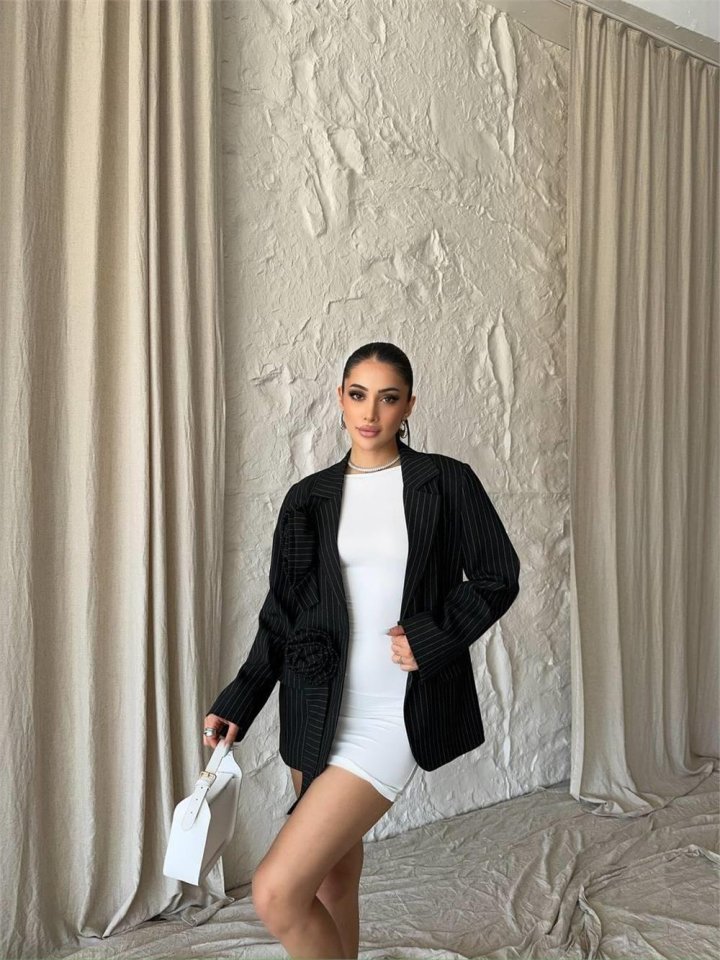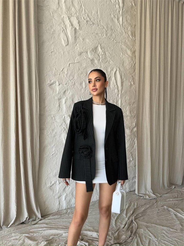 ÇİZGİLİ POLYVİSCON CEKET GÜL ARMALI - Siyah
