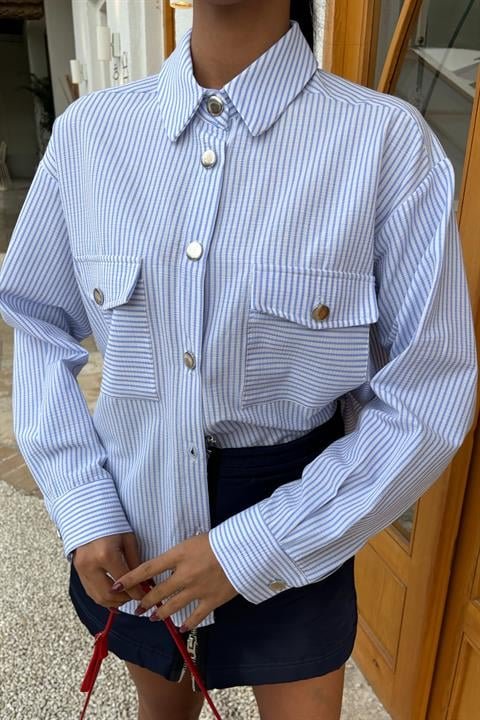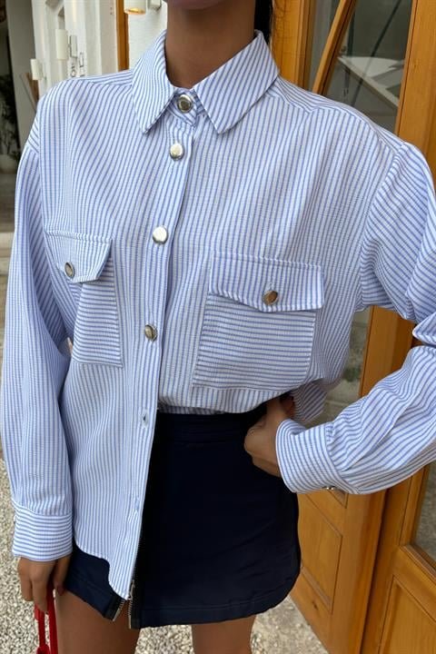 Çizgili Gofre Kumaş Metal Düğmeli Gömlek 3460