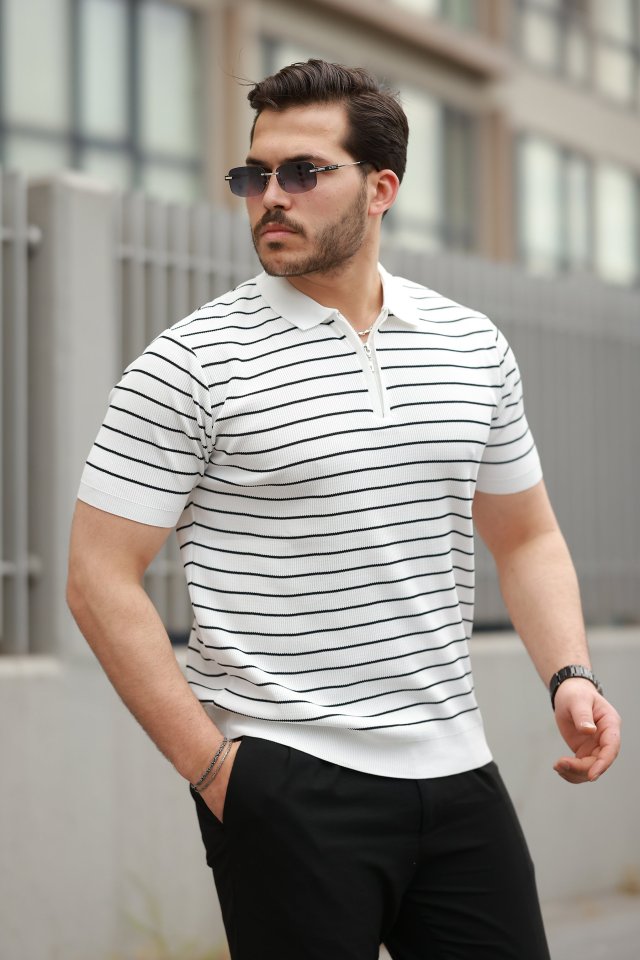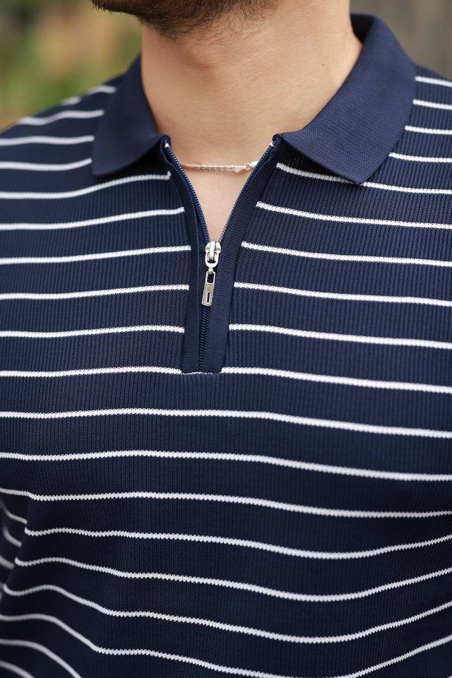 Erkek Fermuar Yakalı çizgili Kısa Kollu T-shirt