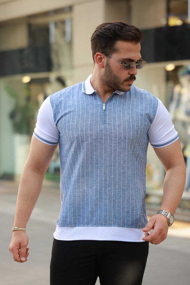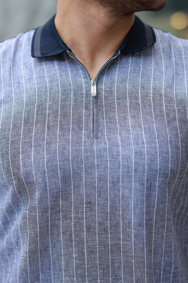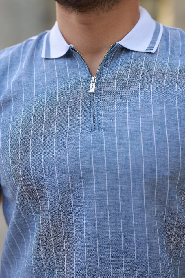 Erkek Fermuar Yakalı çizgili Kısa Kollu Tişört
