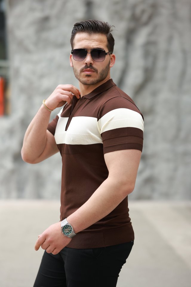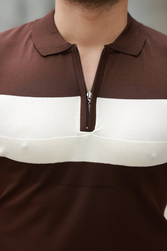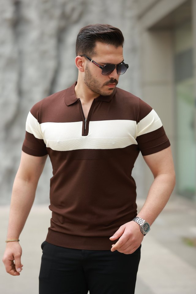 Erkek Fermuar Yakalı şerit Renk Desenli Kısa Kollu Tişört