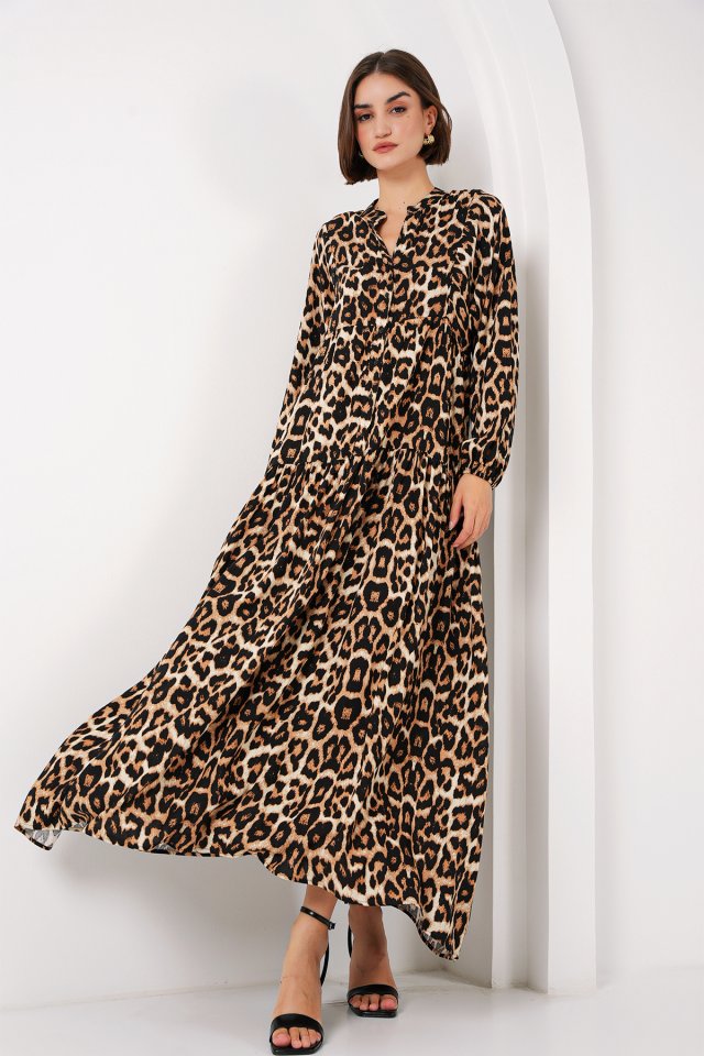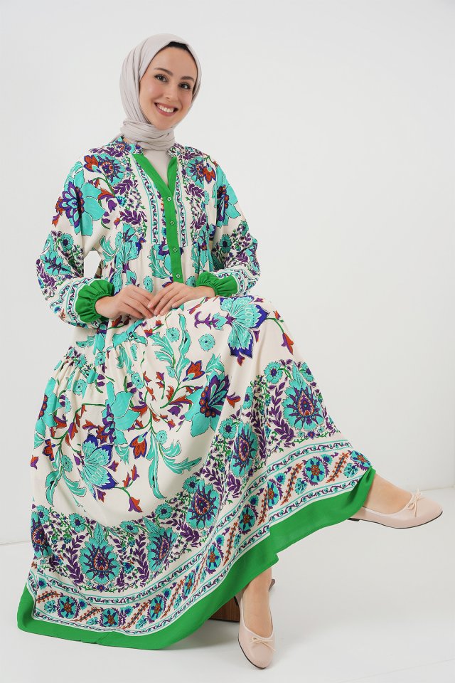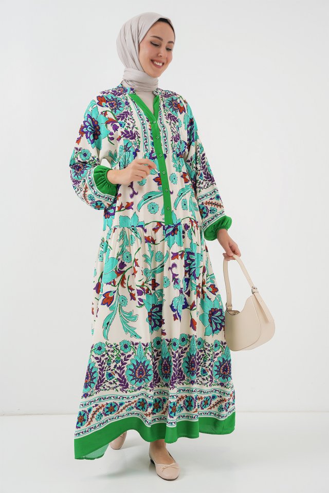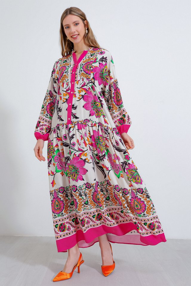 Fuşya Krem Desenli Viskon Tesettür Elbise 2423