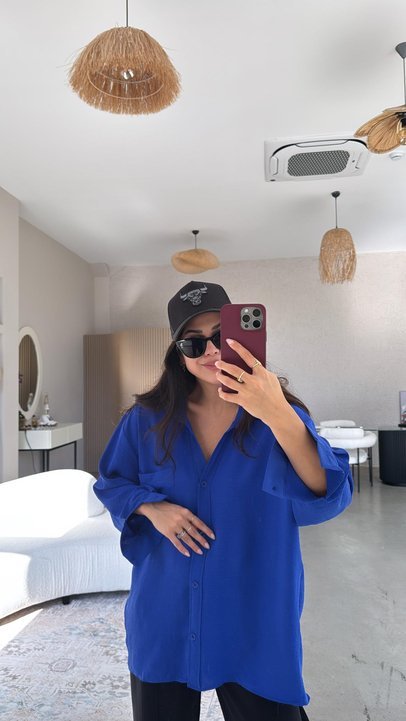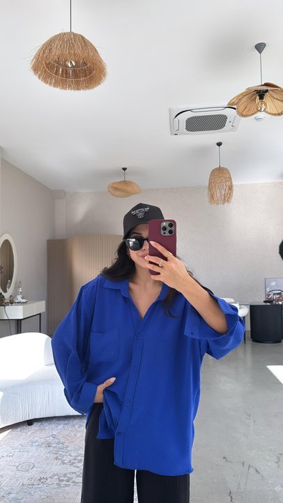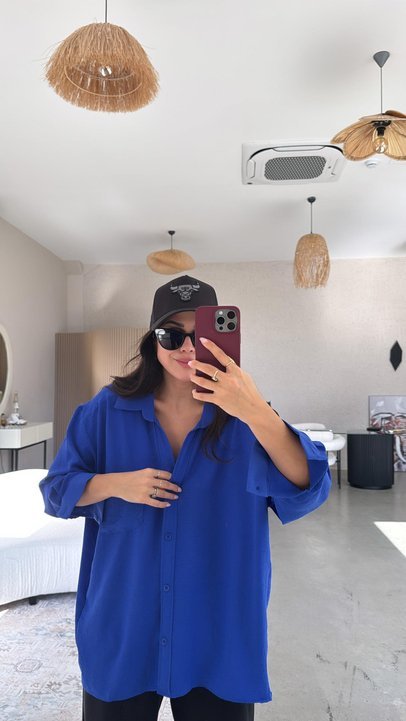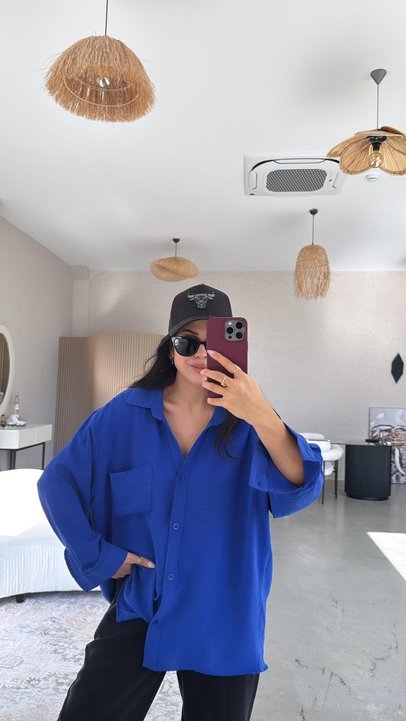 Kadın Flamlı Keten Tek Cep Oversızed Gömlek