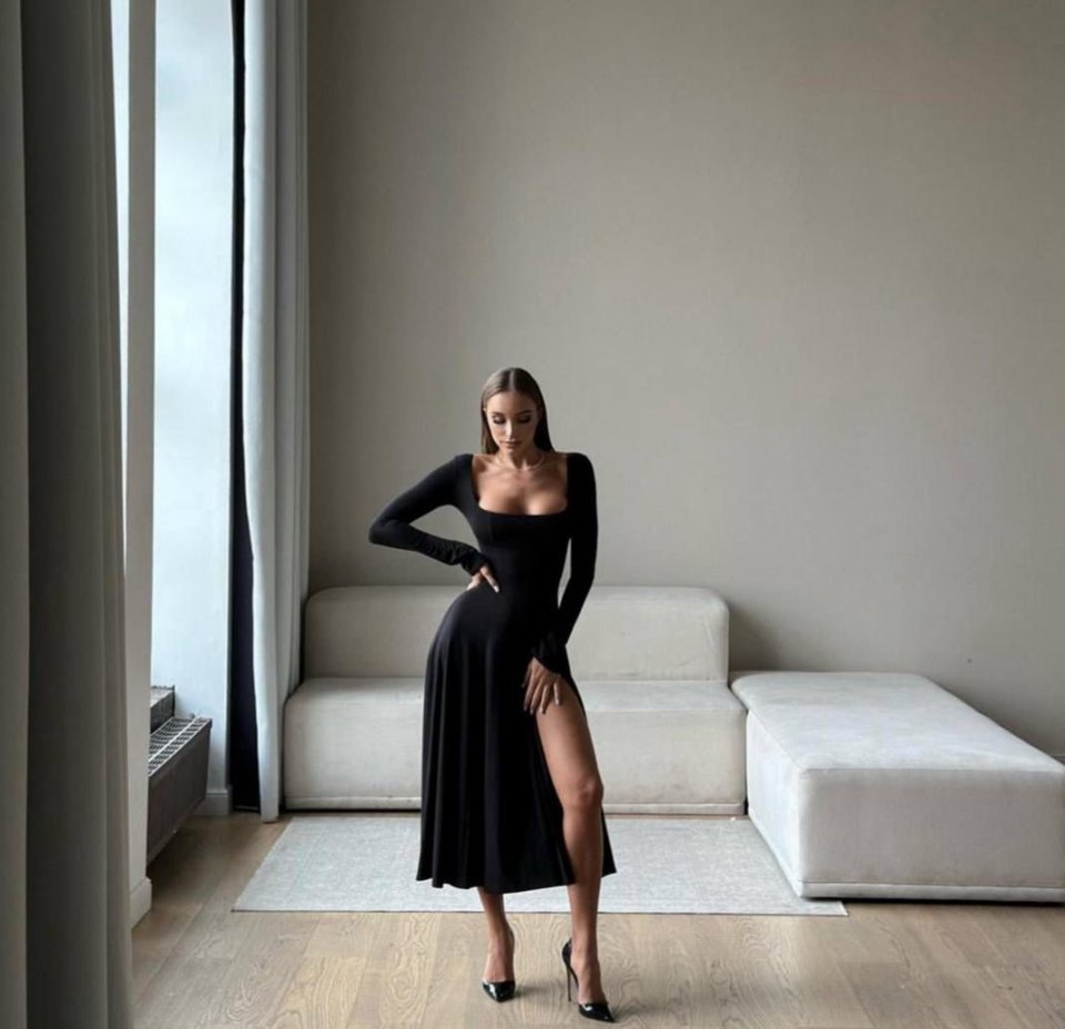 Kadın Kare Yaka Derin Göğüs Ve Bacak Dekolteli Midi Boy Elbise