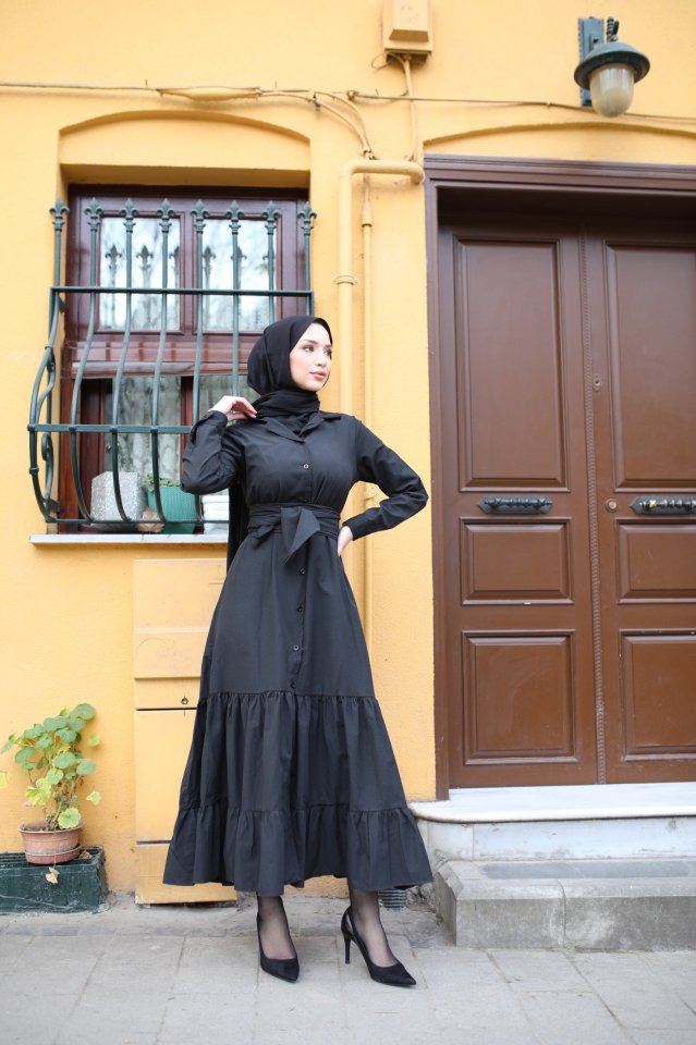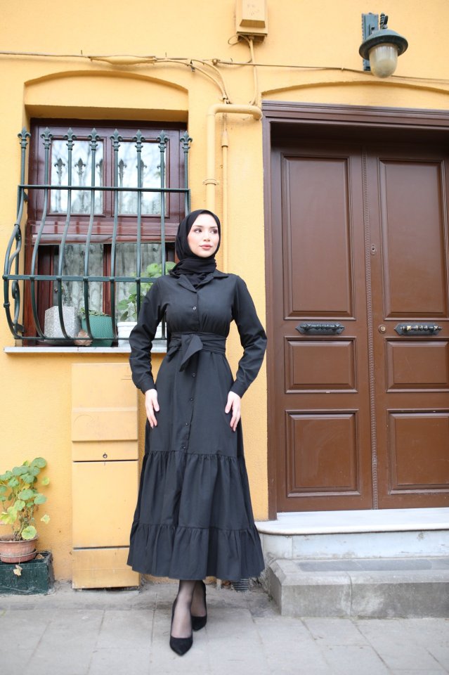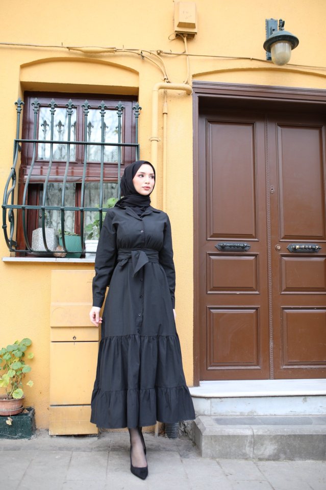 Kadın Uzun Kollu Eteği Fırfırlı Beli Kuşaklı Trikoton Tam Boy Gömlek Elbise