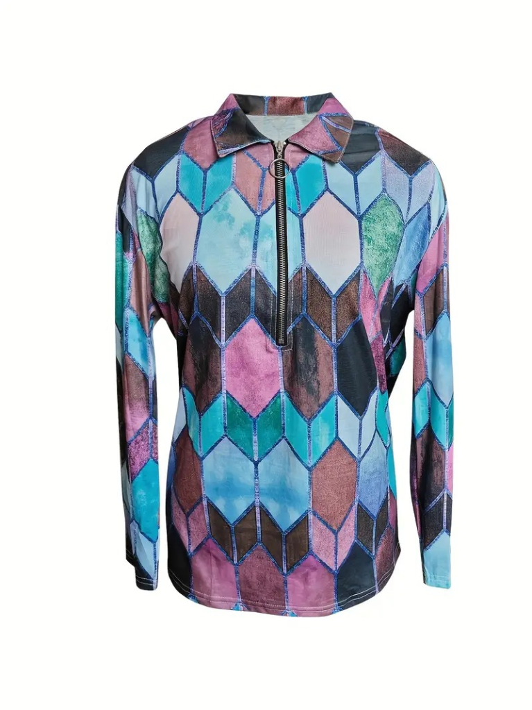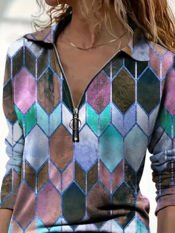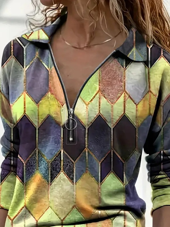 Kadın Uzun Kollu Gömlek Yaka önü Fermuarlı Petek Desen Dijital Baskı Mikro Bluz