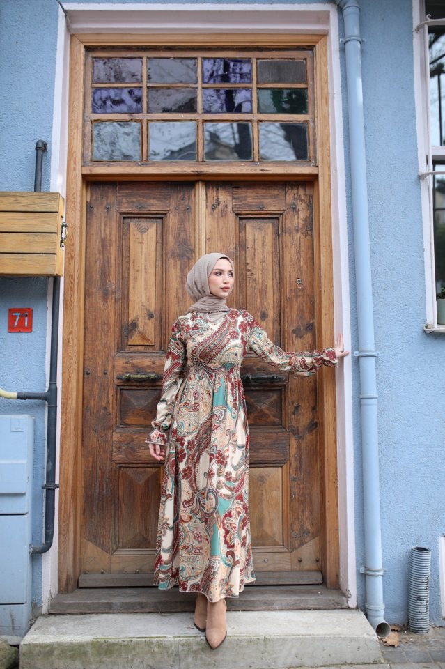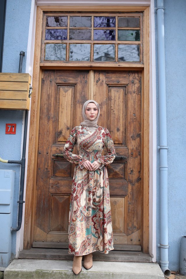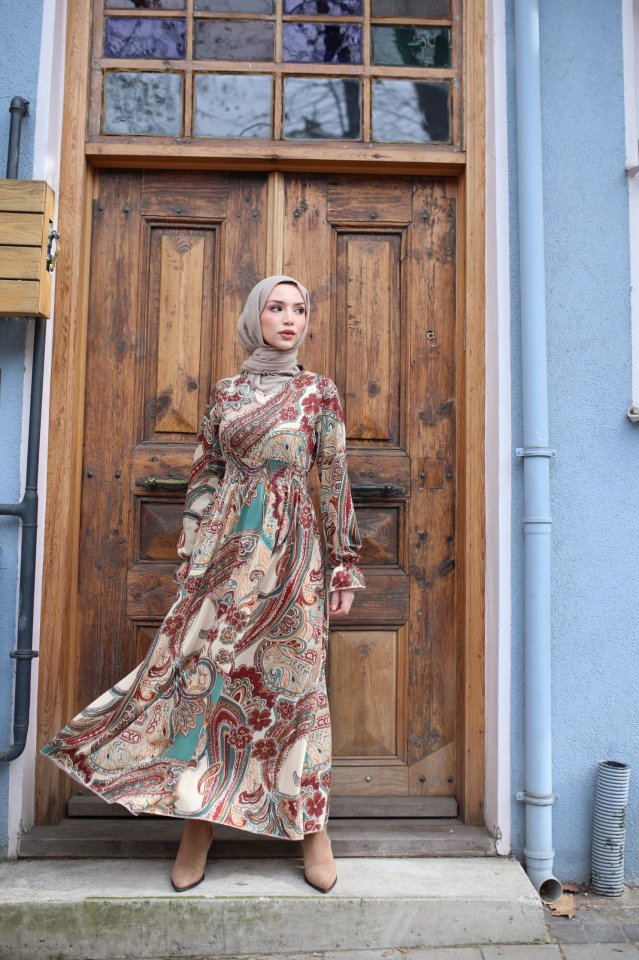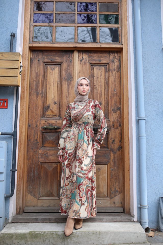 Kadın Uzun Kollu V Yakalı Belden Lastikli Desenli Uzun Süprem Elbise
