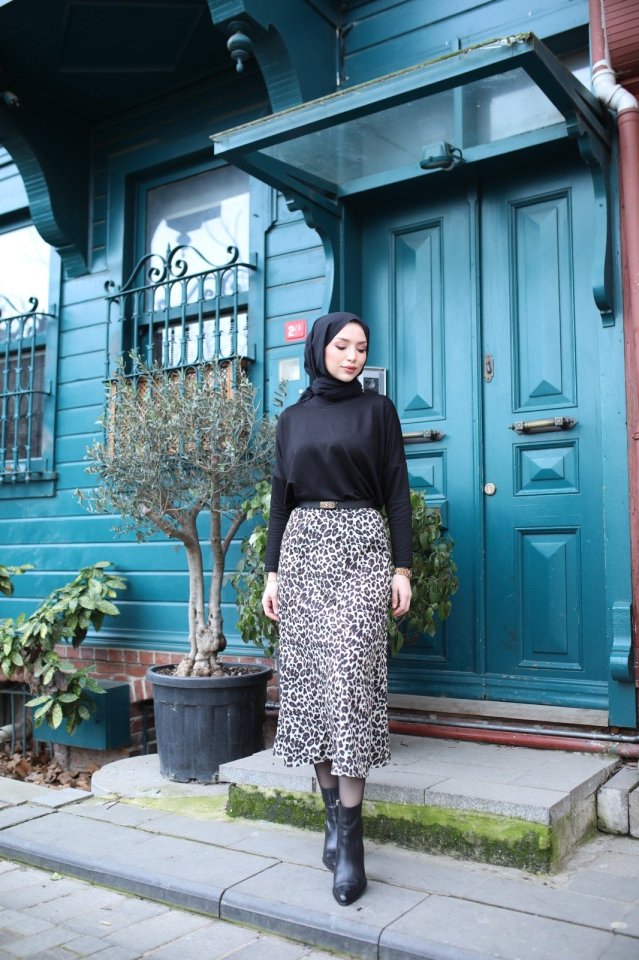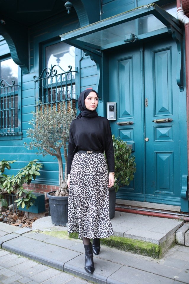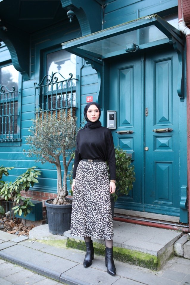 Kadın Yüksek Bel Leopar Desenli Midi Krep Etek