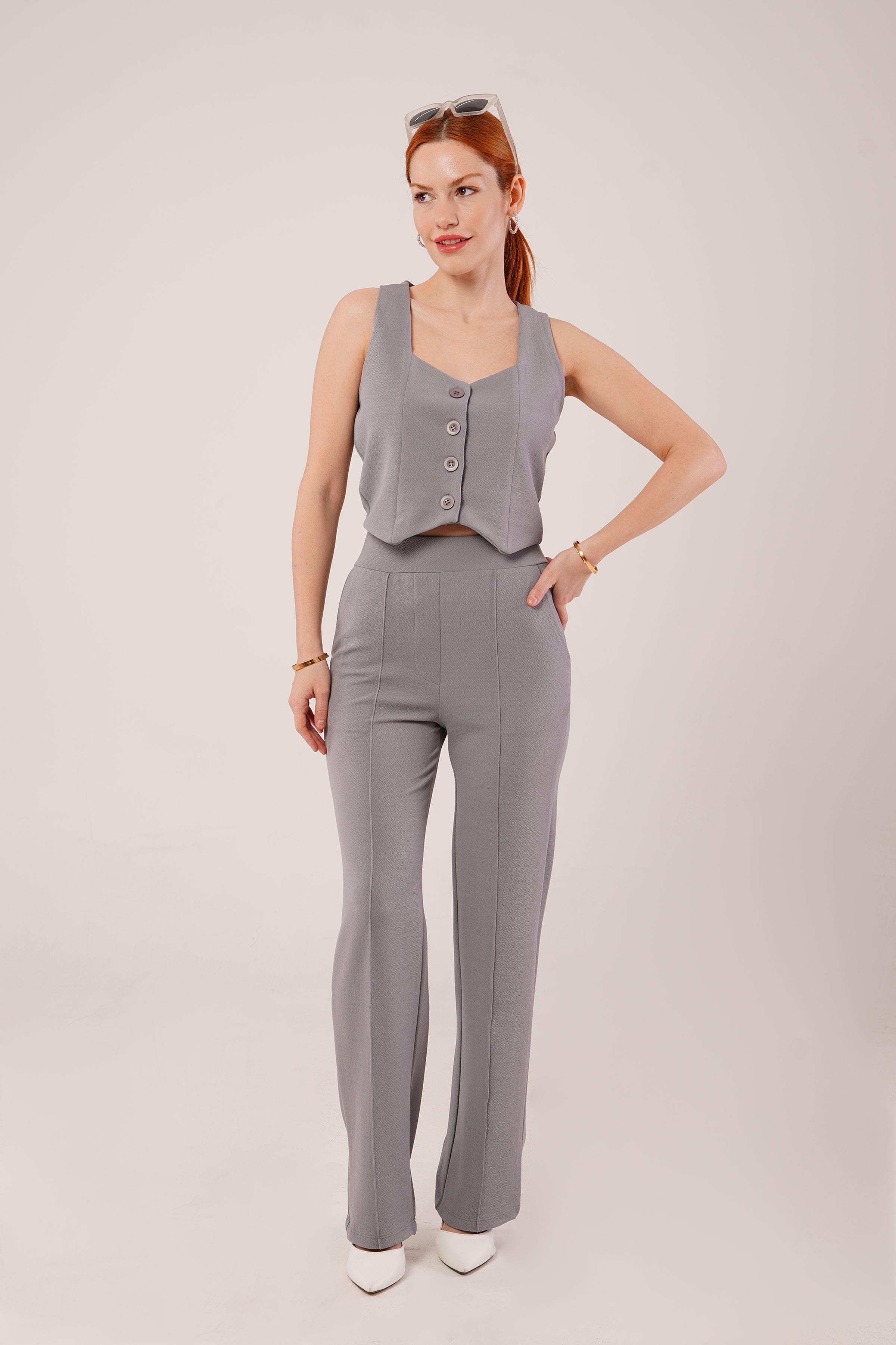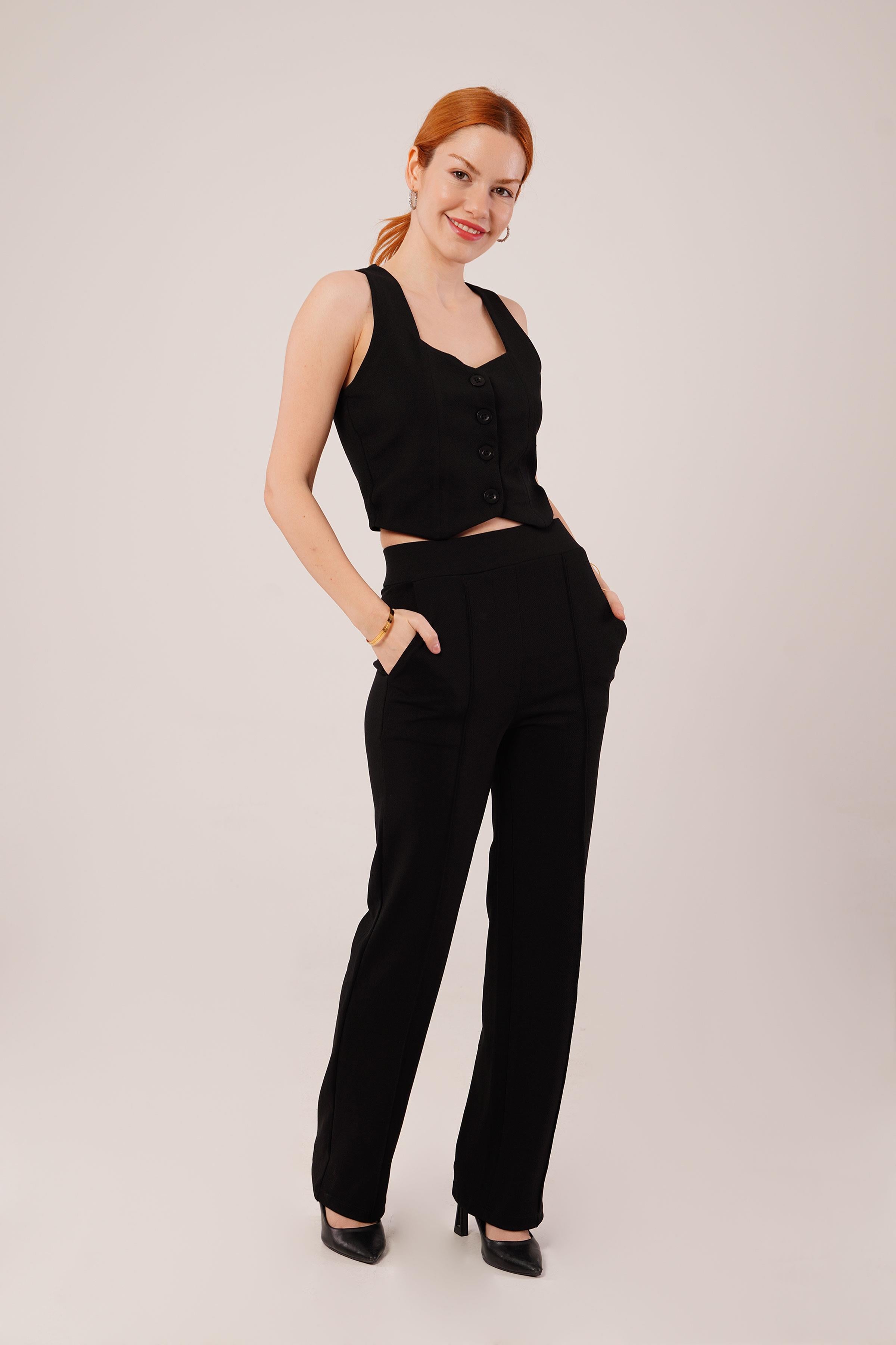 Kalın Askılı Düğmeli Yelek Ve Pantolon Siyah Takım