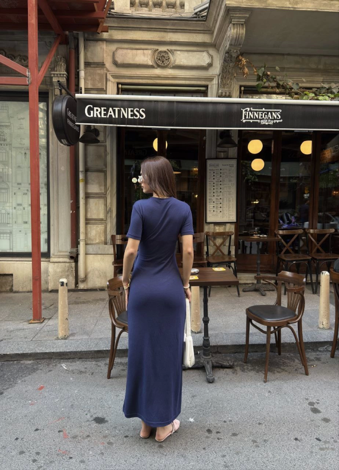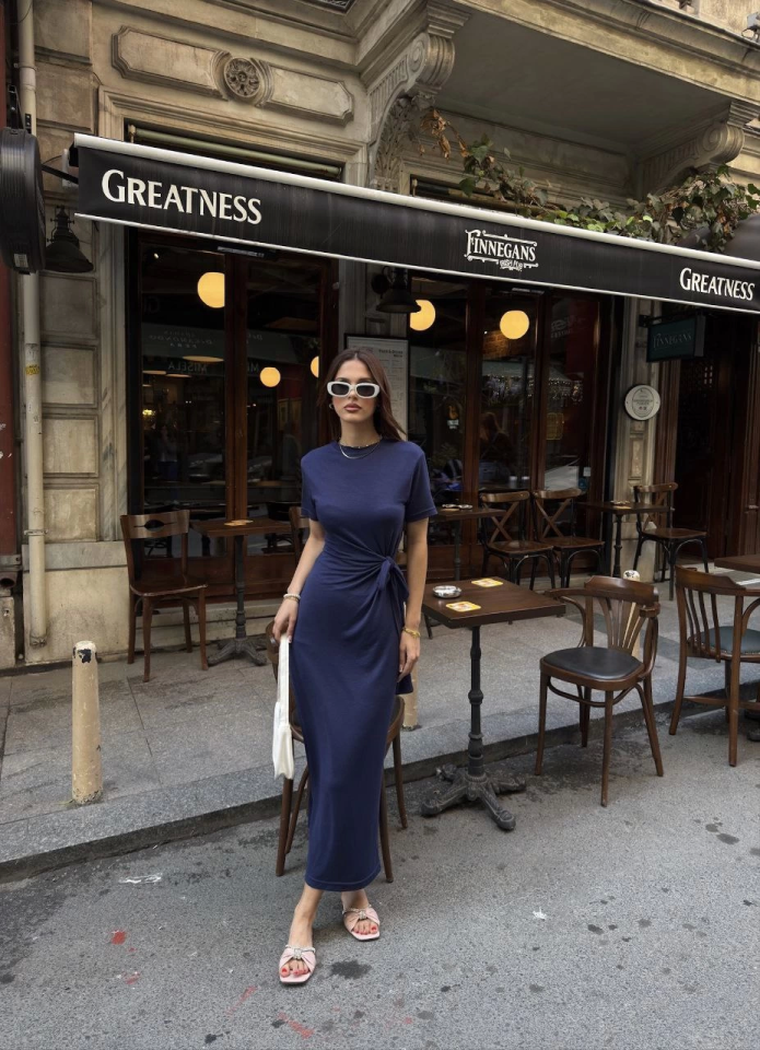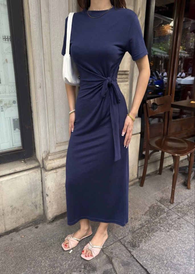 Osy Modal Yumuşak Dokulu Kumaş Bisiklet Yaka Kısa Kollu Kuşaklı Uzun Elbise - Mavi