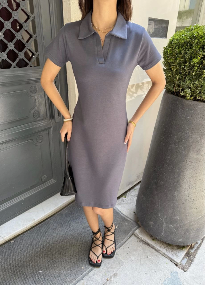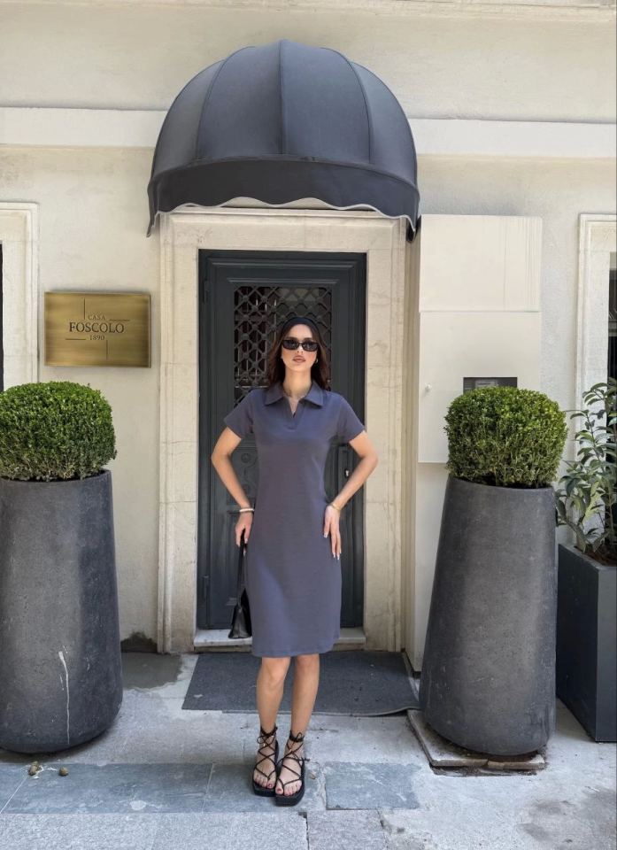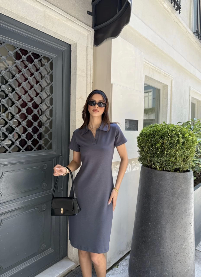Osy Modal Yumuşak Dokulu Kumaş Yakalı Kısa Kollu Elbise - Füme