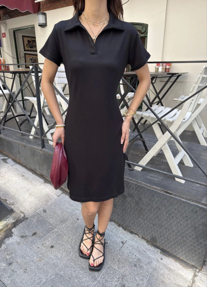 Osy Modal Yumuşak Dokulu Kumaş Yakalı Kısa Kollu Elbise - Siyah