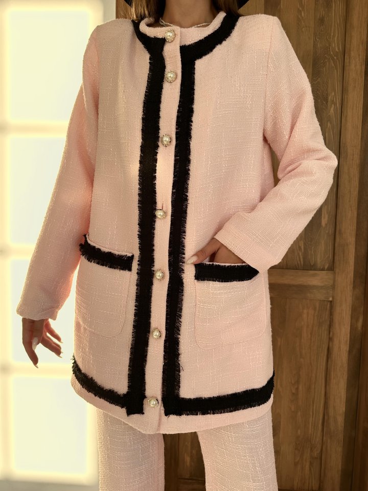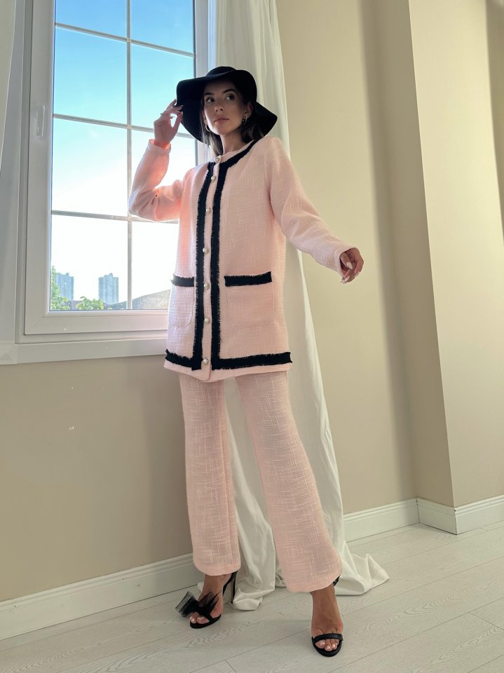 Pembe Siyah Şeritli Yakasız Ceket Ve Pantolon Takım