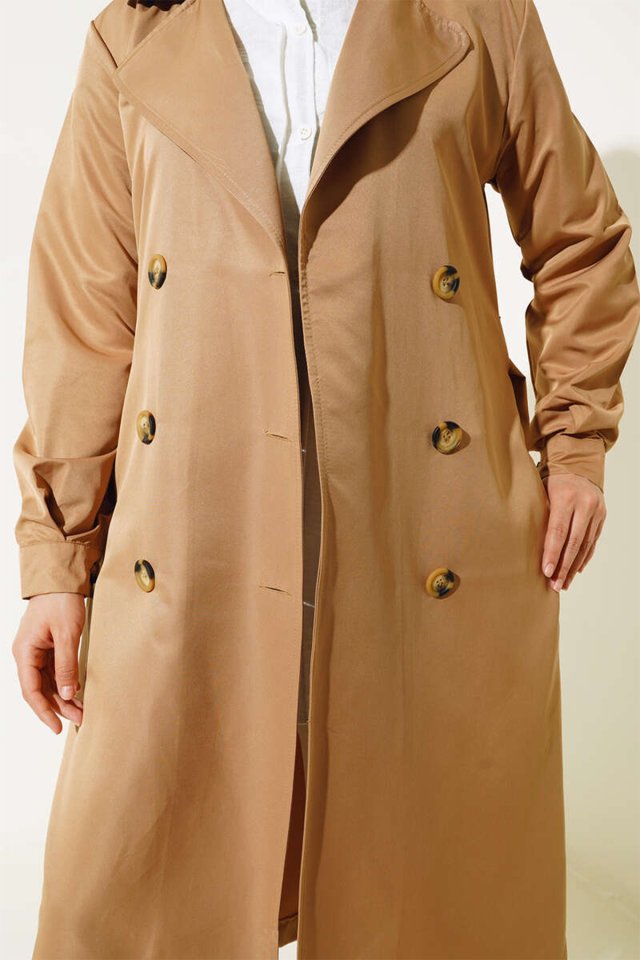 T5853 Kruvaze Yaka Tesettür Trençkot - Taba