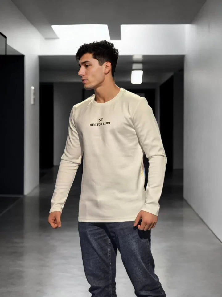 Unisex Bisiklet Yaka Uzun Kollu T-Shirt - Beyaz
