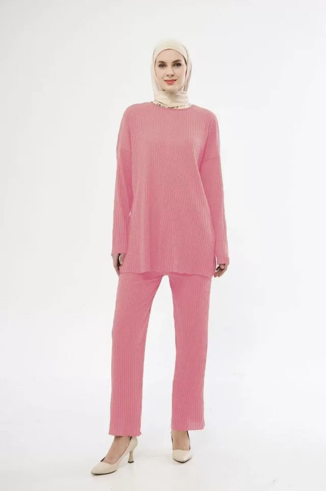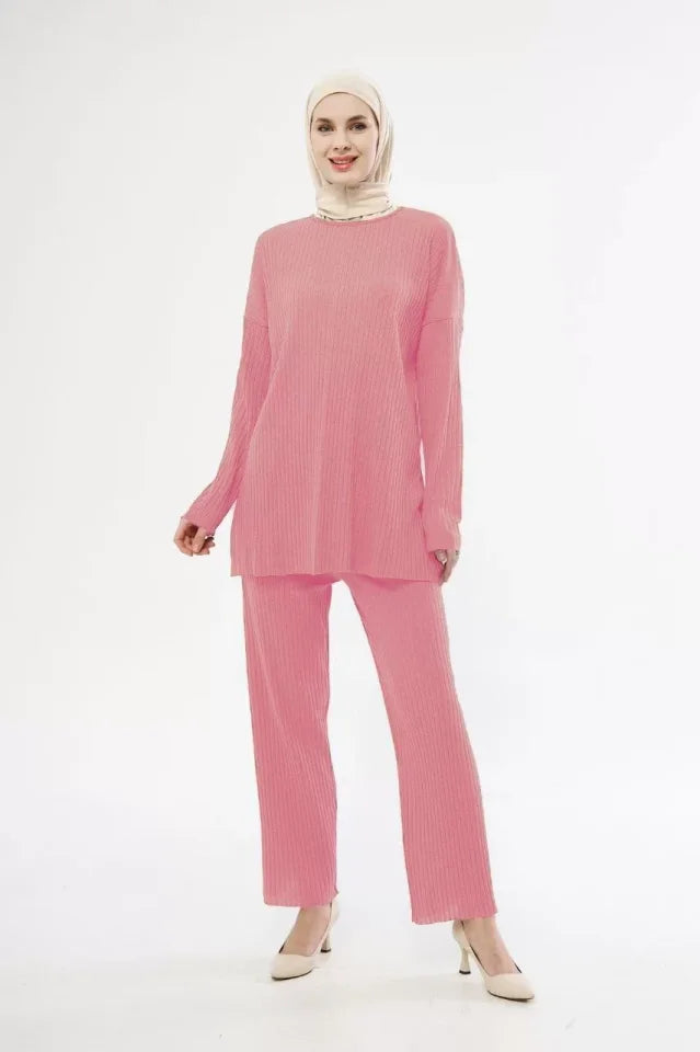 Uzun Kollu Organik Yıkanmış Kumaş Fitilli Pantalonlu Takım - Gül Kurusu